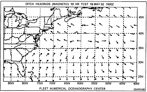 Click here to Order your Radar Equipment Online PRODUCT AVAILABILITY The ditch headings product is available as an analysis and as a forecast at 12-hour increments to 72 hours. See figure 10-3.PRODUCT EXPLANATION The Global Spectral Ocean Wave Model (GSOWM) primary swell direction and primary wave height fields and Navy Operational Global Analysis and Prediction System (NOGAPS) marine wind direction and velocity fields are used to calculate the optimal direction to land an aircraft. The earths magnetic variations are usedPRODUCT USE in the final calculation of the The ditch headings product is generally used in preparation of a transoceanic flight weather packet. In case of distress, the pilot must make a decision on which direction to land an aircraft to minimize impact damage to the aircraft and loss of life. Except in calm seas, ditching an aircraft is more complicated than landing into the wind. Large waves can severely damage aircraft upon impact. Ditch headings are used primarily in instrument flight rule (IFR) conditions when a pilot cannot observe the sea conditions. The general considerations when ditching becomes necessary are as follows:. If only one swell is present, landing should take place parallel to the swell, preferably on the top or backside of the swell.. If two or more swell systems are present, and the primary system is significantly higher, landing should take place parallel to the primary swell. If the swell systems are comparable in height, landing should take place at a 45-degree angle to both swell systems on the downside of the swell.. If the secondary swell system is in the same direction as the wind, landing should take place parallel to the primary swell with the wind and secondary-system at an angle. The choice of whether to land with the angle of the wind upwind or downwind to the plane depends on the wind speed and height of the secondary swell system.. In all cases, if the swell system is huge, it is advisable to accept more cross wind than to land into the swell.PRODUCT LIMITATION The ditch headings product does not take into account secondary swell conditions. For further information, refer to the NODDS Products Manual, FLENUMMETOCCENINST 3147.1.