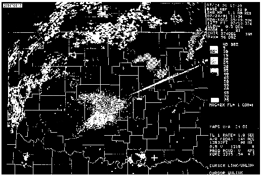 Figure 12-5.-Streaks of low reflectivity extending outward for two radials to the northeast of the radar caused by solar effects.radar, a wide variety of weather features of great importance can be identified. It is beyond the scope of this manual to describe the interpretation of doppler velocity patterns. For a detailed explanation of the interpretation of doppler velocity patterns refer to the FMH-11 (part B).MESOCYCLONE SIGNATURE DETECTION Mesocyclones have been found to be precursors to many tornadoes. They generally have a core diameter of 1.5 to 5 nmi, maximum tangential velocities of 40 kts or greater, and time and height continuity. Previous doppler experiments have found that weak mesocyclone signatures generally result in severe thunderstorms. Stronger signatures generally produce tornadoes, especially if a tornadic vortex signature is present. If an alert is received that a mesocyclone exists, or if there is no alert, but a mesocyclone is suspected, there are several products that can be used to confirm its presence. These products and how they might be used are discussed in the following paragraphs.This information is now available on CD in Adobe PDF Printable Format |