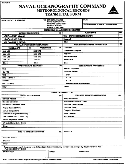 Figure 14-1.-CNMOC Form 3140/6, Meteorological Records Transmittal Form.
