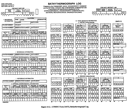 Click here to Order your Radar Equipment Online Bathythermograph Observation Records Forward the original copy of the Bathythermograph Log (Report Symbol 3140-1), CNMOC Form 3167/2 (see fig. 14-2), between the first and fifth of the following month as follows:Classified log sheets are to be forwarded in accordance with OPNAVINST 5510.1 to:Commanding Officer Naval Oceanographic Office ATTN: Code N3412 Stennis Space Center, MS 39522-5001Unclassified log sheets are to be forwarded to: National Oceanographic Data Center 1825 Connecticut Ave., N.W. Washington, DC 20235Ensure all entries of date/time, position, and declassification instructions are included, as appropriate.