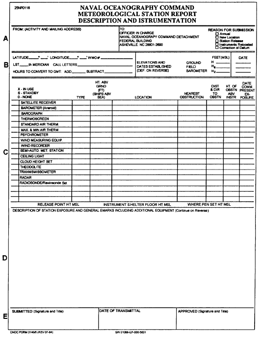 Figure 14-3.-CNMOC Form 3140/5, Meteorological Station and Description Report. This information is now available on CD in Adobe PDF Printable Format |