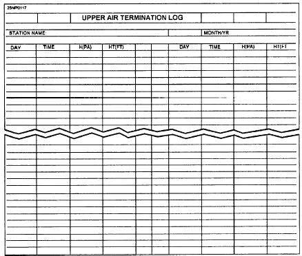 Figure 14-4.-CNMOC Form 3140/3DF, Upper Air Termination Log. appropriate in the event of special incidents that may attract national and/or high-level U.S. Navy interest, and in addition, other incidents that are of interest to the Commander, Naval Meteorology and Oceanography Command (CNMOC). Mission Impairment Incidents impairing mission performance are reported as a Unit Situation Report (UNIT SITEEP) in the format of CNMOC 3100.2, while certain weather-related incidents are reported in accordance with enclosure (1) of the instruction (UNIT SITREP Weather-Related Accidents/Incidents). COMNAVMETOCCOM interest is in incidents causing significant and extended mission impairment that is not adequately covered by the CASREP System. This information is now available on CD in Adobe PDF Printable Format |