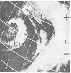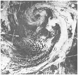 Figure 3-1.-A well developed, comma-shaped cloud is the result of a moving vorticity center to the rear of the polar front. The comma cloud is composed of middle and high clouds over the lower-level cumulus and is preceded by a clear slot.