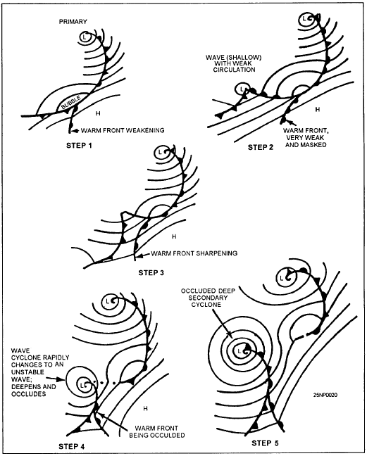 Click here to Order your Radar Equipment Online RELATIVE TO FRONTAL MOVEMENT Wave cyclones form most readily on stationary or slow moving fronts. A preferred position is along a decelerating cold front in the region of greatest deceleration. Normally, the 700-hPa winds are parallel to the front along this area.Under conditions characteristic of the eastern Pacific, a secondary wave cyclone may rapidly develop (fig. 3-7, step 1). As the secondary wave forms on the