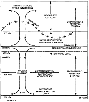 Figure 3-9.-Vertical circulation over developing high. mass, and generally accompanied by cooling in the stratosphere. This is analogous to the deepening of lows where the decrease in mass, generally accompanied by warming at high levels, overcompensates the cooling in the troposphere. The evidence, therefore, indicates that high-level changes, undoubtedly due to dynamic mechanisms in the upper troposphere, are largely responsible for deepening and filling of surface pressure systems. This fact is of considerable prognostic value if the dynamic processes that induce these mass and density changes can be detected on the working charts. This information is now available on CD in Adobe PDF Printable Format |