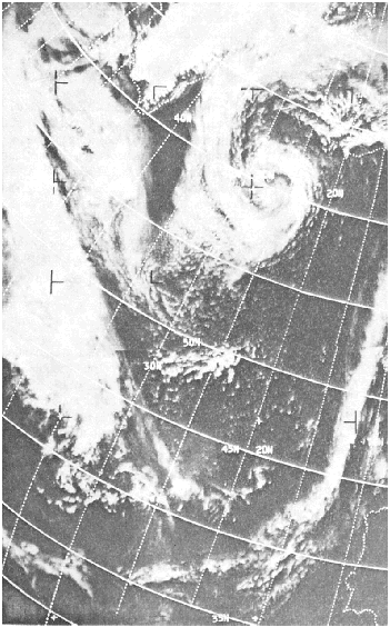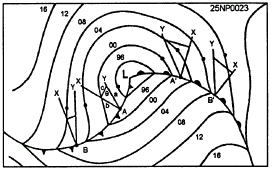 Figure 3-14.-Visual, local noon, third day. 1. Select two to four points along the front where a regular and reliable pressure gradient exists, and determine the geostrophic wind by use of the geostrophic wind scale. (NOTE: Do not use the observed wind.) The wind speed should be determined a short distance behind a cold front and a short distance ahead of the warm front where a representative gradient can be found. The points on the isobars in figure 3-16 serve as a guide to the proper selection of the geostrophic wind measurements.2. Draw a vector toward the front, parallel to the isobars from where the geostrophic wind was determined. The vectors labeled "y" in figure 3-16 illustrate this step.3. Draw a vector perpendicular to the front originating at the point where the "y" vector intersects the front, and label this vector "x," as illustrated in figure 3-16.4. At a convenient distance from the intersection, along the "x" vector, construct a perpendicular to the "x"