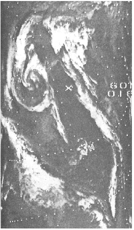 Figure 3-15.-Infrared, local midnight, third night. vector, letting it intersect the "y" vector. This is line c in figure 3-16. 5. The angle formed at the intersection of the "y" vector and the perpendicular originating from the "x" vector is labeled q (theta). Measure angle q to the nearest degree with a protractor, and determine the value of its sine by using trigonometric tables or a slide rule. 6. Let side a of the right triangle formed in step 4 represent the value of the geostrophic wind obtained in step 1, and call it "Cgs." Solve the triangle for side b by multiplying the sine of q by the value of Cgs. The resulting value of b is the component of the wind normal to the front, giving it its forward motion. The formula is b= Cgs x sin q