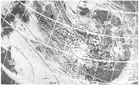 Figure 4-8.-Open cells on satellite Imagery. When this polar air mass moves out over the water, the moist layer is shallow and capped by a subsidence inversion near the coast. Further downstream the vertical extent of the moist layer and the height of the clouds increases due to air mass modifications by the underlying surface. In figure 4-8, the open cells behind a polar front over the North Atlantic indicate cold air advection and cyclonic curvature of the low-level wind flow. Vertical thickness of the cumulus at A is small, but increases eastward toward B.Figure 4-9 shows a large area of the subtropical high west of Peru covered with open cells. These are not associated with low-level cyclonic flow or steady cold air advection.This information is now available on CD in Adobe PDF Printable Format |