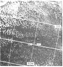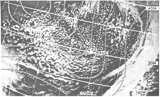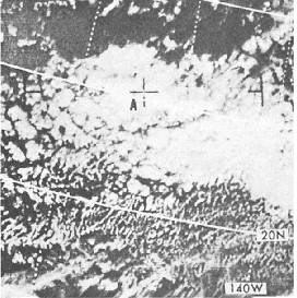 Figure 4-9.-Open cells in the subtropical high. vertical convective activity is not likely. Figure 4-10 shows closed cells in the southeastern portion of a polar high near A.Figure 4-11 shows closed cells in the eastern portion of a subtropical high in the South Pacific. West of A, the closed cells are composed of stratocumulus with some clear walls, and east of the walls, the cells are composed of thinner clouds.The practical training publications, Satellite Imagery Interpretation in Synoptic and Mesoscale Meteorology, NAVEDTRA 40950, and Tropical Clouds and Cloud Systems Observed in Satellite Imagery, Volume 1, NAVEDTRA 40970, offer further information on the subject of satellite interpretation.VERTICAL MOTION AND WEATHERUpward vertical motion (convection) is associated with increasing cloudiness and precipitation, and downward vertical motion (subsidence) with improving weather.Vertical motion analyses and prognostic charts are currently transmitted by the NWS and FNMOC. The values are computed and are on the charts. charts. Plus values represent upward vertical motion (convection), and minus values represent downward vertical motion (subsidence).VORTICITY AND PRECIPITATION Vorticity was discussed in chapter 1 of this manual, as well as the AG2 TRAMAN, volume 1. We have seen that relative vorticity is due to the effects of both curvature and shear. Studies have led to the following rules:Cloudiness and precipitation should prevail in regions where the relative vorticity decreases downstream. Fair weather should prevail where relative vorticity increases downstream. The fact that both shear and curvature must be considered when relative vorticity changes are investigated results in a large number of possible combinations on upper air charts. When both terms are in agreement, we can confidently predict precipitation or fair weather. When the two are in conflict, a closer examination is required.