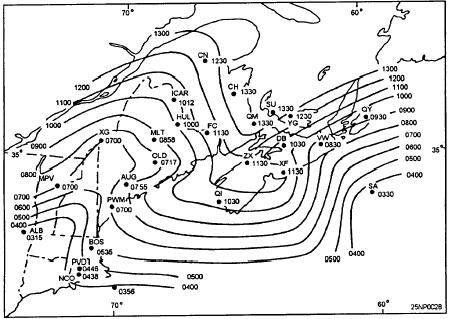 Figure 4-12.-Isochrones of beginning of precipitation, an early winter situation. It is important to recognize the difference between the behavior of the actual cloud base height and the variation of the ceiling height, as defined in airway reports. The ceiling usually drops rapidly, especially during the first few hours after the rain or snow begins. However, if the rain or snow is continuous, the true base of the cloud layer descends gradually or steadily. The reason for this is that below the precipitation frontal cloud layer there are usually shallow layers in which the relative humidity is relatively high and which soon become saturated by the rain. The cloud base itself has small, random fluctuations in height superimposed on the general trend.Time of Lowering of Ceiling Forecasting the time when a given ceiling height will be reached during rain is a separate problem, Nomograms, tables, air trajectories, and the time air will become saturated can all be resolved into an objective technique tempered with empirical knowledge and subjective considerations. This forecast can be developed for your individual station.Extrapolation of Ceiling Trend by Means of the x-t DiagramThe x-t diagram, as mentioned previously in this chapter, can be used to extrapolate the trend of the ceiling height in rain. The hourly observations should be plotted for stations near a line parallel to the probable movement of the general rain sea, originating at your terminal and directed toward the oncoming rain area. Ceiling-time curves for given ceiling heights may be drawn and extrapolated. There may be systematic geographical differences in the ceiling between stations due to local (topographic) influences. Such differences sometimes can be anticipated from climatological studies, or experience. In addition, there may be a diurnal ceiling fluctuation, which will become evident in the curve. Rapid and erratic up-and-down fluctuations also must be dealt with. In this case, a smoothing of the curves may be necessary before extrapolation can be made. A slightly less accurate forecast may result from this process.In view of the previous discussion of the precipitation ceiling problem, it is not expected that mere extrapolation can be wholly satisfactory at a station when the ceiling lowers rapidly during the first hours of rain, as new cloud layers form beneath the front. However, by following the ceiling trend at surrounding stations, patterns of abrupt ceiling changes may be noted. These changes at nearby stations where rain started earlier may give a clue to a likely sequence at your terminal.This information is now available on CD in Adobe PDF Printable Format |