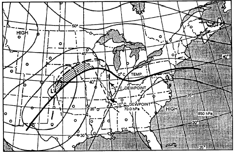 Figure 4-25.-Illustration of the location of the maximum snow area. The low center moved to Iowa in 24 hours, and the maximum snow area spread northeast along the area 50 to 75 miles either side of a line through Minneapolis to Houghton, Michigan.causing daytime temperature readings to be relatively lower than normally expected, and nighttime temperatures to be relatively higher. The stability of the lapse rate has a marked effect on insolation and terrestrial radiation. With a stable lapse rate, there is less vertical extent to heat; therefore, surface heating takes place more rapidly. With an unstable lapse rate, the opposite is true. If there is an inversion, there is less cooling, since the surface temperature is lower than that of the inversion layer; that is, at some point the energy radiated by the surface is balanced by that radiated by the inversion layer.Advection One of the biggest factors affecting temperature is the advection of air. Advection is particularly marked in its effect on temperature with frontal passage. If a frontal passage is expected during the forecast period, the temperature must be considered. Advection within an air mass may also be important. This is particularly true of sea and land breezes and mountain breezes. They affect the maximum and minimum temperatures and their time of occurrence.Vertical Heat Transport Vertical heat transport is a temperature factor. It is considerably affected by the windspeed. With strong wind there is less heating and cooling than with light wind or a calm because the heat energy gained or lost is distributed through a deeper layer when the turbulence is greater.This information is now available on CD in Adobe PDF Printable Format |