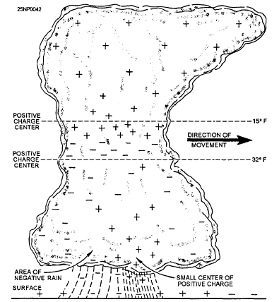 Figure 5-1.-Location of electric charges inside a typical thunderstorm cell. conditions listed below are generally representative of many (but not necessarily all) thunderstorms.. The chance of severe or extreme turbulence within thunderstorms is greatest at higher altitudes, with most cases of severe and extreme turbulence about 8,000 to 15,000 feet above ground level (AGL). The least turbulence may be expected when flying at or just below the base of the main thunderstorm cloud. (The latter rule would not be true over rough terrain or in mountainous areas where strong eddy currents produced by strong surface winds would extend the turbulence up to a higher level.). The heaviest turbulence is closely associated with the areas of heaviest rain.. The strongest updrafts are found at heights of about 10,000 feet AGL or more; in extreme cases, updrafts in excess of 65 feet per second occur.. Downdrafts are less severe, but downdrafts on the order of 20 feet per second are quite common.. The probability of lightning strikes occurring is greatest near or slightly above the freezing level. Because of the potential hazards of flying in a thunderstorm, it is obviously nothing short of folly for pilots to attempt to fly in thunderstorms, unless operationally necessary.This information is now available on CD in Adobe PDF Printable Format |