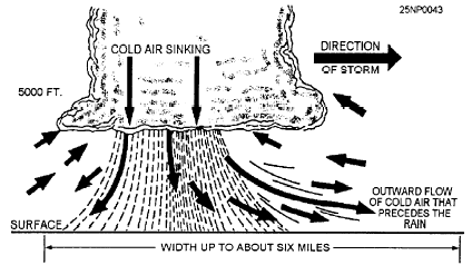 Figure 5-2.-Cold dome of air beneath a thunderstorm cell in the mature stage. Arrows represent deviation of windflow. Dashed lines indicate rainfall.thunderstorm conditions. If the data are old and inaccurate, an aircraft mishap could result.THUNDERSTORM FORECASTING The standard method of forecasting air mass thunderstorms has long consisted primarily of an analysis of rawinsonde data with particular emphasis on the so-called "positive areas."Many times conditions are favorable for thunderstorm development, with a large positive energy area showing up on the sounding, with no ensuing thunderstorm activity. At other times, thunderstorms may occur when they are not forecasted. Clearly, factors other than instability are important, and, at times, of overriding importance.A number of thunderstorm forecasting methods have been developed, but many of these are beyond the scope of this manual. The forecasting of convective clouds by using variations of the parcel method are covered in this section. Further, a method for the prediction of these storms that enables the forecaster to arrive at a fairly accurate, reasonably objective forecast will be discussed.For a more detailed discussion of the determinations of instability, stability, the convective condensation level (CCL), the level of free convection (LFC), and the lifting condensation level (LCL), refer to the AG2 TRAMAN, volume 2.THE PARCEL METHOD The temperature of a minute parcel of air is assumed to change adiabatically as the parcel is displaced vertically from its original position. If, after vertical displacement, the parcel has a higher virtual temperature than the surrounding atmosphere, the parcel is subjected to a positive buoyancy force and will be further accelerated upwards; conversely, if its virtual temperature has become lower than that of the surrounding air, the parcel will be denser, and eventuallyreturn to its initial or equilibrium position,This information is now available on CD in Adobe PDF Printable Format |