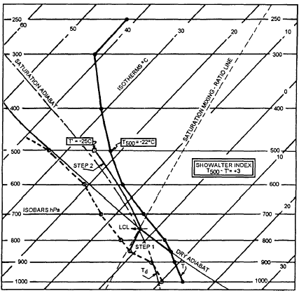 Figure 5-7.-Computation of the Showalter Stability Index (SSI). FORECASTING MAXIMUM GUSTS WITH NONFRONTAL THUNDERSTORMSMaximum gusts associated with thunderstorms occur over a very small portion of the area in which the thunderstorm exists, and usually occur immediately before the storms passage. Nevertheless, the possibility of damage to aircraft and installations on the surface is so great that every available means should be used to make the best and most accurate forecast possible to forewarn the agencies concerned.This information is now available on CD in Adobe PDF Printable Format |