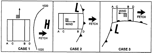 Figure 6-5.-Examples of moving fetches. shows three cases where a fetch AB has moved to the position CD on the next map 6 hours later. The problem is determining what part of the moving fetch area to consider as the average fetch for the 6-hour period. In figure 6-5, Case 1, the fetch moves perpendicular to the wind field. The best approximation is fetch CB. Therefore, in a forecast involving this type of fetch, use only the part of the fetch that appears on two consecutive maps. The remaining fetch does contain waves, but they are lower than those in the overlap area.In figure 6-5, Case 2, the fetch moves to leeward (in the same direction as the wind), Since waves are moving forward through the fetch area, the area to be used in this case is fetch CD.Case 3, figure 6-5, depicts the fetch moving windward (against the wind). Since the waves move toward A, the region AC will have higher waves than the area BD. Experience has shown that in this case AB is the most accurate choice for a fetch,Determining Accurate Wind Speed The most obvious and accurate way to determine wind speed over a fetch is to average the reported values from ships. This method has the advantage of not requiring a connection for gradients or stability. But often there are only a few ship reports available, and ship reports are subject to error in observation, encoding, or transmission.A second way to determine wind speed is to measure the geostrophic wind from the isobaric spacing and then correct it for curvature and stability. At first it would seem this would be less desirable due to the extra time necessary for corrections. However, barometric pressure is probably the most reliable of the parameters reported by ships, and a reasonably accurate isobaric analysis can be made from a minimum number of reports. For these reasons the corrected geostrophic wind is considered to be the best measure of wind speed over the fetch, except of course in cases where there is a dense network of ship reports where wind direction and speed are in good agreement.The reason for correction to geostrophic wind is that the isobars must be straight for a correct measure of the wind. When the isobars curve, other forces enter into the computations. The wind increases or decreases depending on whether the system is cyclonic or anticyclonic in nature. The stability correction is a measure of turbulence in the layer above the water. Cold air over warmer water is unstable and highly turbulent, making the surface wind more nearly equal to the geostrophic wind. Conversely, warm air over colder water produces a stable air mass and results in the surface wind being much smaller than the geostrophic wind.Three rules for an approximation of the curvature correction are as follows:1. For moderately curved to straight isobars-no connection is applied.2. For great anticyclonic curvature-add 10 percent to the geostrophic wind speed.3. For great cyclonic curvature-subtract 10 percent ffom the geostrophic wind speed.In the majority of cases the curvature correction can be neglected since isobars over a fetch area are relatively straight. The gradient wind can always be computed if more refined computations are desired.In order to correct for air mass stability, the sea air temperature difference must be computed. This can be done from ship reports in or near the fetch area aided by climatic charts of average monthly sea surface temperatures when data is too scarce. The correction to be applied is given in table 6-2. The symbol Ts stands for the temperature of the sea surface, and Ta for the air temperature.This information is now available on CD in Adobe PDF Printable Format |