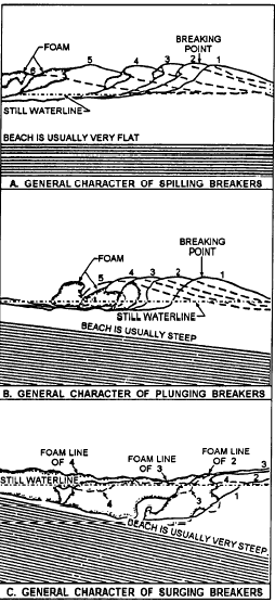Figure 6-9.-General characteristics of spilling, plunging, and surging breakers.is released Plunging breakers are more commonly associated with swell waves that approach the beach with much longer wavelengths. The shortening of the wavelength as the wave feels bottom causes a great mass of water to build up in the crest in a short time. Longer period swell waves may double in height when feeling bottom.SURGING BREAKER. Surging breakers are normally seen only with a very steep beach slope. This type of breaker is often described as creating the appearance that the water level at the beach is suddenly rising and falling. The entire face of the wave usually displays churning water and produces foam, but an actual curl never develops.This information is now available on CD in Adobe PDF Printable Format |