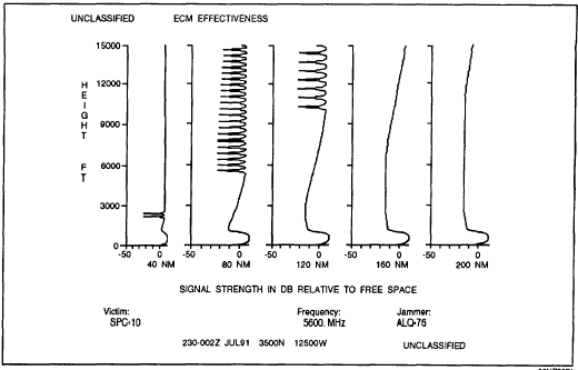 Figure 7-1.-Example output of the ECM effectiveness display. LIMITATIONS AND ASSUMPTIONS The restrictions as well as the principles taken for granted in using the DVAL program areas follows:. The algorithm used by this program applies to a maximum altitude of 11,000 geopotential meters.. The D-value for MSL is determined by extrapolating the pressure and temperature data to MSL by using the data for the first two levels of the entered environmental profile. Caution should be exercised in determining over-water surface D-values using radiosonde data from a coastal location when the balloon-release height is >50 meters.FUNCTIONAL DESCRIPTION AD-value is defined as a difference in the observed height of a particular isobaric surface and the height associated with that isobaric surface in the U.S. Standard Atmosphere. Table 7-1 shows an example of the D-value profile.