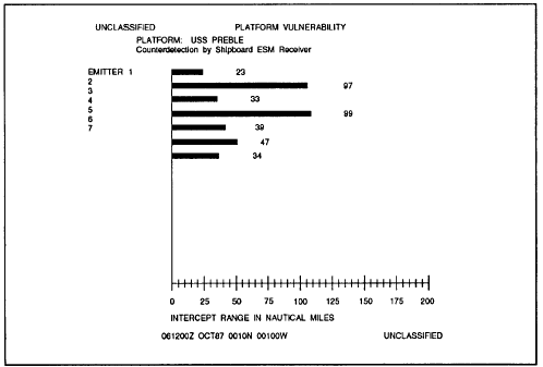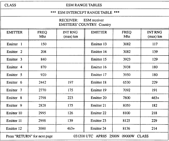 Table 7-2.-Example Output of ESM Range Tables APPLICATION The EMCON planner can use PV to assess the relative vulnerability of the various emitters on a platform versus their value in surveillance or communication. The object is to minimize the platforms vulnerability to counterdetection.LIMITATIONS AND ASSUMPTIONS The restrictions as well as the principles taken for granted in listing the PV program areas follows:refractivity data set is indicative of the location and time of interest. PV is range- and time-independent. . The maximum intercept range output is limited to 1000 km (541 nmi). The atmosphere is usually not horizontally homogeneous over these great distances.. PV doesnt account for absorption of EM energy, In general, the absorption of EM energy by things such as oxygen, water vapor, fog, rain, or snow adds little to the propagation loss. Refraction is considered the main factor in transmission.. PV is valid for frequencies between 100 MHz and 20 GHz.. Sea-reflected interference is also considered only if the receiver or emitter is below 100 m.. The effects of a surface-based duct are considered to dominate any contributions from the evaporation duct.. PV assumes the emitters are radiating at peak power.. The probability of detection associated with the output ranges depends upon the probability of detection associated with the receiver sensitivities.. If you are attempting to verify ESM intercept ranges achieved by your own receiver, remember that PV outputs maximum intercept range. If a platforms emitters arent turned on at that range, there will be nothing to intercept.FUNCTIONAL DESCRIPTION PV computes the maximum ESMR of an emitter. ESMR is computed only if the emitters frequency falls within one of the frequency bands of the receiver. Table 7-3 shows an example output of the PV program. The bar graph shows the maximum range that