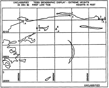 Figure 8-1.-Example output of the Tides Geographic Display. NAVSAR uses the search objects description its last known location, and environmental data to estimate the search object location at the time of the search. Using search asset information provided by the SMC, the program will provide search recommendations in terms of rectangular areas in which to search.LIMITATIONS AND ASSUMPTIONS The restrictions as well as the principles taken for granted in using the NAVSAR program areas follows:. There are three search object location scenarios to define the search objects location prior to distress time. These are Last Known Position, Trackline, and Area of Uncertainty. The operator can select up to five plans of action to enter on the status board, but only one can be a Trackline scenario.. There are two processing modes used by NAVSAR that result in different output formats for the recommended search plan. The first processing mode is referred to as level I. The level I mode occurs when the only object location scenario is the Last Known Position scenario. The recommended search is evenly distributed over the entire area, All other location scenarios and combinations of scenarios invoke the level II mode. The recommended search plan will contain a search effort density map. Search effort concentration is given as swept areas.. A level I recommended search plan can be added to the status board. A level II recommended search plan cannot be added to the status board, but can be entered manually as a search plan via the search plan data.. The operator selects the type of object to be searched from a predefine list.. A search object trackline is described by up to four leg segments defined as either all great-circle or rhumb lines.. Each search object location scenario must have a confidence value entered by the user. The total confidence values for all scenarios must add up to 100 percent. When revising the status board, the operator enters anew search object location scenario, and at least one of the previous location scenario confidence entries must be changed so that the total confidence for all scenarios is once again 100 percent.. Up to eight weather and sea-current observations can be entered into NAVSAR. Sea-current observations that do not include the wind current need wind-speed and -direction observations prior to the time of the sea-current observation. Ideally, wind-speed and-direction observations representing conditions 48 hours before the sea-current observation should be entered. If there are no sea- or wind-current observations, sources of sea-current data consists of Fleet Numerical Meteorological and Oceanographic Center (FNMOC) monthly current charts and the Naval Oceanographic Office (NAVOCEANO) surface-current atlases.. A maximum of five search assets can be entered on the status board for a particular search.. Up to five search object probability maps can be requested for display in sequence.. A maximum of five search plans can be added to the status board.. NAVSAR computes the sweep widths for both visual and electronic search sensor types. For any other sensor types, the user must provide the sweep width.. The searching altitude to enter for aircraft is the flight altitude; for ships, it is the bridge height or the height of the sensor.. Search object location maps can only be produced after the earliest distress scenario date-time group (DTG).FUNCTIONAL DESCRIPTION NAVSAR can be subdivided into three main functions:1. The status board maintenance function performs the data base management.2. The map generation function purpose is to produce probability maps for the search object at user-entered times based on the data available in the current status board.3. The search planning function is to provide search plan recommendations that allow the most effective use of the available search assets.Table 8-2 shows an example output of the View Status Board. This is an organized table of the search object description, location scenarios ejection