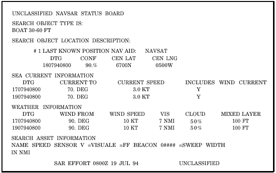 Table 8-2.-Example Output of the NAVSAR View Status Board information, sea-current data, weather observations, search asset data, and search plan information. Figure 8-2 shows an example output of the search location density map. The output shows numbered cells that represent relative probabilities of the search object being located within the cell.Table 8-3 shows an example output of a search recommendation, level I. This is a tabular display describing a recommended rectangular search area. The available assets are listed with their on-station duration and area of coverage. Also shown is the position of the search and the cumulative detection probability of previous searches.This information is now available on CD in Adobe PDF Printable Format |