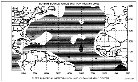 Click here to Order your Radar Equipment Online RANGE VERSUS DEPTH Long-range paths can occur with water depths greater than 1,000 fathoms, depending on bottom slope. At shallower depths high intensity loss is produced from multiple-reflected bottom bounce paths that develop between the source and receiver. Since 85 percent of the ocean is deeper than 1,000 fathoms and bottom slopes are generally less than or equal to 1, relatively steep angles can be used for single bottom reflection. With steeply inclined rays, transmission is relatively free from thermal effects at the surface, and the major part of the sound path is in nearly stable water.ACTIVE DETECTION Inactive detection, bottom bounce transmission can produce extended ranges with fewer shadow zones because more than one single-reflected bottom path exists between the sonar and the target. These paths combine to produce an increase in the received signal and reduce the extent of the shadow zone. The major factors affecting bottom bounce transmission include the angle at which the sound ray strikes the bottom (grazing angle), the sound frequency, the bottom composition, and the bottom roughness.There are two graphic outputs available with the BBR product.1. A shaded bottom bounce range display. The amount of shading indicates the range in nmi. See figure 9-3. Light 1-5 nmi range Medium 5-10 nmi range Heavy >10 nmi range 2. A shaded bottom bounce probability display. This product provides estimates of the existence of low-loss bottom bounce paths between a sonar (source) and the target (receiver) based on the environmental and geoacoustic parameters. See figure 9-4. The amount of shading indicates the probability conditions as follows: Clear No Medium Fair Heavy Good
