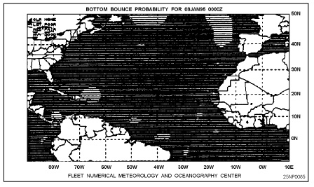 Figure 9-4.-A shaded bottom bounce probability display. There is only one graphic output available with the SLD product. It is a shaded sonic layer depth display. The amount of shading indicates the range of depth in feet. See figure 9-5.Clear <50 ft Light 50-100 ft Medium 100 350 ft Heavy >350 ft SURFACE DUCT CUTOFF FREQUENCY (SFD)LEARNING OBJECTIVES: Describe the two conditions under which a surface duct may occur. Evaluate the SFD product. Identify the graphic output of the product. The SFD product displays the cutoff frequency values where a surface duct may occur in the mixed layer of the ocean if one of two conditions exist: (1) the temperature in the layer increases with depth or (2) an isothermal layer is near the surface. In condition 1, sound speed increases as the temperature increases. In condition 2, there is no temperature or salinity gradient and pressure causes sound speed to increase with depth.In the mixed (or surface) layer the velocity of sound is susceptible to the daily and local changes of heating, cooling, and wind action. Under prolonged calm and sunny conditions the mixed layer disappears and is replaced by water where the temperature decreases with depth. This information is now available on CD in Adobe PDF Printable Format |