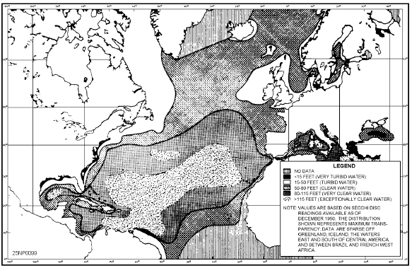 Click here to Order your Radar Equipment Online Reflectance and Contrast For a target to be visible, it must contrast with its background.Water Color Deep (clear) water is very transparent to the blue portion of the light spectrum and less transparent to the green, yellow, red, and violet portions. In the more turbid coastal waters, green and yellow light penetrates to greater depths than does blue.Sea State Irregular sea surfaces affect visibility in several ways. Variable refraction results in a reduction of the contrast of a target. Winds that barely ruffle the surface reduce contrast of a target by as much as 40 percent.Incident Illumination The amount of incident illumination, as determined by cloud coverage and the sun above the horizon, is a definite consideration in underwater visibility.Optical Image The optical image of a target can be due to its own light, to reflected light, or to its being silhouetted against an illuminated background.GEOGRAPHIC VARIATION OF TRANSPARENCYFigure 9-14 depicts the Seawater transparency of the North Atlantic. Figure 9-14 also shows that deep North Atlantic waters range in transparency from approximate y 50 feet off the continental slope to over 115 feet in the Sargasso Sea.EFFECTS OF OCEAN FRONTS, EDDIES, AND UPWELLINGLEARNING OBJECTIVES Define oceanic fronts, eddies, and upwelling. Recognize typical locations of oceanic fronts, eddies, and upwelling in the Pacific and Atlantic oceans. Be familiar with the effects of oceanic fronts, eddies, and upwelling on acoustics. Recognize oceanic front, eddy, and upwelling locations using satellite data.