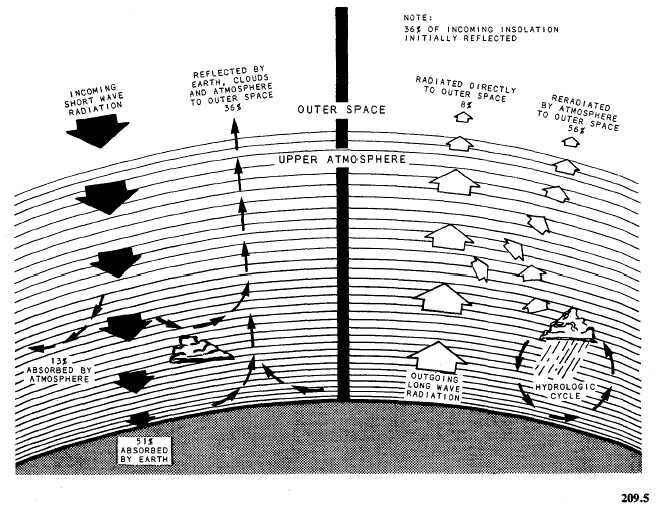 Click here to Order your Radar Equipment Online Greenhouse Effect The atmosphere conserves the heat energy of Earth because it absorbs radiation selectively. Most of the solar radiation in clear skies is transmitted to Earths surface, but a large part of the outgoing terrestrial radiation is absorbed and reradiated back to the surface. This is called the GREENHOUSE effect. A greenhouse permits most of the short-wave solar radiation to pass through the glass roof and sides, and to be absorbed by the floor, ground or plants inside. These objects reradiate energy at their tempera-tures of about 300K, which is a higher temperature than the energy that was initially received. The glass absorbs the energy at these wavelengths and sends part of it back into the greenhouse, causing the inside of the structure to become warmer than the outside. The atmosphere acts similarly, transmitting and absorbing in somewhat the same way as the glass. If the greenhouse effect did not exist, Earths tempera-ture would be 35C cooler than the 15C average temperature we now enjoy, because the insolation would be reradiated back to space. Of course, the atmosphere is not a contained space like a greenhouse because there are heat transport mechanisms such as winds, vertical currents, and mixing with surrounding and adjacent cooler air. RADIATION (HEAT) BALANCE IN THE ATMOSPHERE The Sun radiates energy to Earth, Earth radiates energy back to space, and the atmosphere radiates energy also. As is shown in figure 1-2-7,