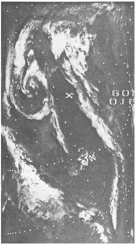 Figure 10-3-7.IR, dissipating vortex. below and becomes unstable. This difference in stability produces two distinctly different cloud patterns, which are readily seen in satellite pictures. The clouds in the southerly flow are primarily stratiform, while those in the northerly flow are cumuliform. The surface ridgeline is located in the narrow region between the two cloud patterns.Another feature that will help you locate a surface ridge over oceanic areas is known as SUN GLINT. Sun glint is created by the Suns reflec-tion off a smooth sea surface, and it occurs most often in the center of elongated high-pressure systems. The ridgeline is oriented in the direction