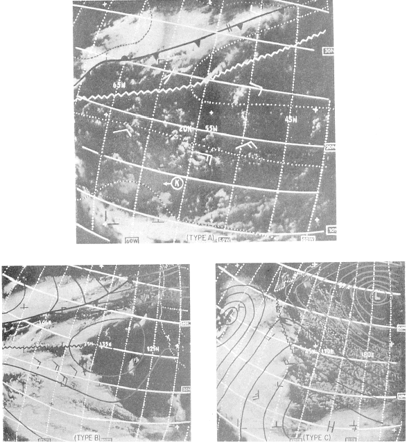 Click here to Order your Radar Equipment Online Surface Ridgelines Although these features are not as well defined on satellite pictures as frontal systems, their positions can be determined by the experienced interpreter. The three characteristics of cloud patterns found with surface ridgelines are illustrated in figure 10-3-8.The type A cloud pattern is characterized by long cloud lines, or fingers, that extend in a continuous fashion from a frontal band. Generally, these cloud lines are oriented in a more north-south direction than the frontal band. The end of each cloud line serves as a point for positioning the surface ridgeline. Type A cloud patterns are commonly found along the southwestern side of the subtropical high-pressure centers.The type B cloud pattern is found on the western side of a subtropical high-pressure area where the clouds change in character from cumuliform to stratiform. Notice that the points drawn for the ridgeline are drawn so that they lie along the line where the cloud type changes from cumuliform to stratiform. This change in cloud character is generally found where the low-level wind changes from a southeasterly to a south-westerly direction. As the air moves rapidly poleward, stability increases near the surface, producing the observed change in cloud form. The type C pattern is associated with a sharp migrating surface ridge that lies between two large low-pressure centers in close proximity to each other. Along this ridge, there is a windshift from a generally southwesterly direction to the northwest. The air in the southerly flow cools as it moves north over cooler water and becomes more stable with time. Air in the northerly flow is heated from