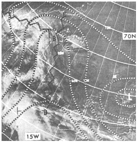 Figure 10-3-15.500-mb analysis and satellite photograph showing narrow cloud band associated with a sharp ridge.appearance. See figure 10-3-16. If a comma-shaped cloud area (PVA MAX) is present equatorward of the vortex, the trough is drawn to the west of the comma cloud.Jet Streams The distribution and appearance of cirrus clouds help us in locating jet streams. Jet-stream cirrus are usually much higher than other widespread cloud patterns. In visual imagery, they occasionally cast shadows on lower cloud decks or surface features. These shadows appear as long, narrow dark lines with a slight anticyclonic turning. A jet is located parallel to and within 1 degree of latitude poleward of such shadows. Figure 10-3-17 shows a shadow line cast by a higher cirrus deck. A jets position can also be determined by the texture and brightness of clouds in its vicinity. Poleward of a jet, the clouds have a bumpy appearance, while on the equatorward side the clouds are smooth. Another cirrus pat-tern associated with jet streams is transverse cloud bands. See figure 10-3-18. This pattern is not ordinarily seen in the IR mode. The jet axis is located poleward and runs perpendicular to the bands. The cloud pattern most frequently associated with a polar jet is a large, anti-cyclonically curved cirrus shield with a sharp poleward edge. Look for this pattern between the upper-level trough and the downstream upper-level ridge. Jet streams are also found in conjunc-tion with long narrow streaks of cirrus; however, accurately pinpointing a jets location is more difficult with this pattern, because the streaks lack continuity. The streaks nearly parallel the windflow and are equatorward of the jet axis.Learning Objective: Identify land and water features seen in imagery. |