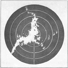 Figure 104-2.Line echo wave pattern (LEWP) in a squall line as it appears on a PPI scope.however, the overall echo tends to disappear and the thunderstorm cells remain.RAIN OR SNOW. Since water droplets scatter about five times as much energy as cor-responding snow crystals, the return from snow tends to be weaker, and the differences of intensity within a snowstorm are generally much less than in a rainstorm. Both texture and behavior help in distinguishing rain echoes from those of snow. A typical PPI presentation of snow is a uniformly hazy or coarse echo with very diffused edges. The texture of snow echoes is often described as soft in contrast to the sharp or hard echoes produced by rain.Another clue as to what kind of echo is in-volved may be found by varying the gain setting. There seems to be much more variation in the intensity of rain than of snow. A rain echo, as the gain is reduced, does not disappear as a unit. Certain portions fade out much more quickly than others. With snow, there is much greater likelihood that the entire echo will disappear at once. This characteristic may be used to good advantage in identifying the nature of the echo-producing substance. |