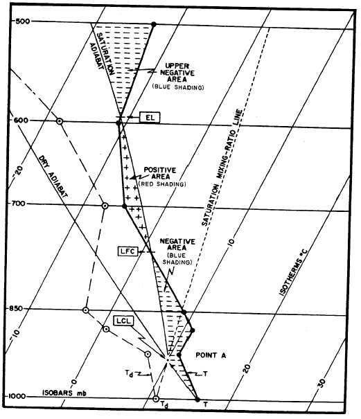 Log P diagram. The determination of an area as positive or negative depends upon whether the parcel is being lifted mechanically (by a front or orographic barriers) or by convective means and whether the environment is colder or warmer than the ascending parcel. Positive areas are conducive to instability. Negative areas are conducive to stability.TYPES OF CONDITIONAL INSTABILITY. Conditional instability may be one of three types. The REAL LATENT type is a con-dition in which the positive area is larger than the negative area (potentially unstable). The PSEUDOLATENT type is a condition in which the positive area is smaller than the negative area (potentially STABLE). The STABLE type is a condition in which there is no positive area.NOTE: The computing of positive and nega- tive energy areas and Skew-T analysis is covered in detail in AG2, Vol. 2, Unit 3. Figure 2-4-9shows an example of analyzed positive and Autoconvection AUTOCONVECTION is a condition started spontaneously by a layer of air when the lapse rate of temperature is such that density increases with elevation. For density to increase with altitude, the lapse rate must be equal to or exceed 3.42C per 100 meters. (This is the AUTOCONVECTIVE LAPSE RATE.) An example of this condition is found to exist near the surface of the earth in a road mirage or a dust devil. These conditions occur over surfaces that are easily heated, such as the desert, open fields, etc.; they are usually found during periods of intense sur-face heating. |