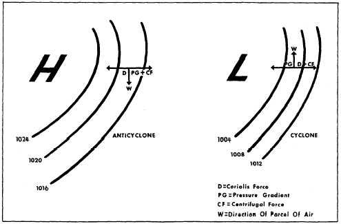 Click here to Order your Radar Equipment Online Cyclostrophic Wind In some atmospheric conditions, the radius of rotation becomes so small that the centrifugal force becomes quite strong in comparison with the Coriolis force. This is particularly true in low latitudes where the Coriolis force is quite small to begin with. In this case, the pressure gradient force is nearly balanced by the centrifugal force alone. When this occurs, the wind is said to be cyclostrophic. By definition, a cyclostrophic wind exists when the pressure gradient force is balanced by the centrifugal force alone. This exact situation rarely exists, but is so nearly reached in some situations that the small Coriolis effect is neglected and the flow is said to be cyclostrophic. Winds in a hurricane or typhoon and the winds around a tornado are considered cyclostrophic. Movement of Wind Around Anticyclones The movement of gradient winds around anticyclones is affected in a certain manner by the pressure gradient force, the centrifugal force, and the Coriolis force. The pressure gradient force acts from high to low pressure, and the Coriolis force acts opposite to the pressure gradient force and at right angles to the direction of movement of the parcel of air. The centrifugal force acts at right angles to the path of motion and outward from the center about which the parcel is moving. (See fig. 3-1-12.) In the case of a high pressure center, the pressure gradient force and the centrifugal force balance the Coriolis force. This phenomenon may be expressed in the following manner: