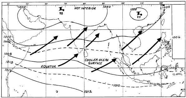 however, as maximum heating occurs, the flow The sea breeze continues until the land area cools sufficiently to dissipate the weak low pressure. After sunset, the land cools at a faster rate than the adjacent waters and eventually pro-duces a complete reversal of the winds. As the land continues to cool through the evening hours, a weak area of high pressure forms over the land. The water area, with its warmer temperatures, has slightly lower pressure and again a flow is established; however, the flow is now from land to water (offshore). (See fig. 3-3-3.) The land breezes, when compared to the sea breezes, are less extensive and not as strong (usually less than 10 knots and less than 10 miles offshore). This is because there is less temperature contrast at night between land and water surfaces as compared to the temperature contrast during daytime heating. Land breezes are at maximum development late at night, in late fall and early winter. In the tropical land regions, the land and sea breezes are repeated day after day with great regularity. In high latitudes the land and sea breezes are often masked by winds of synoptic features. |
