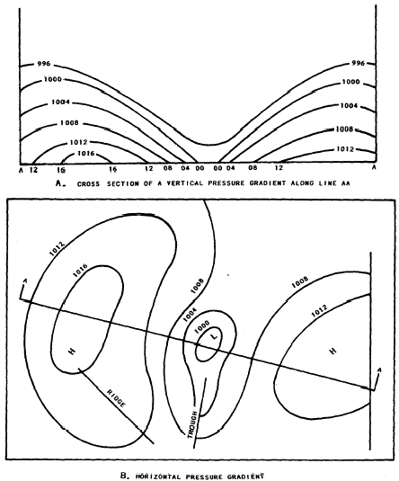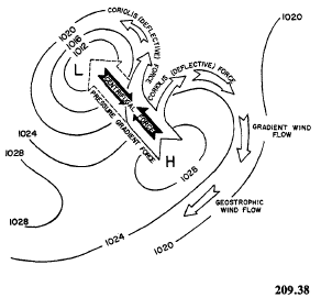 Click here to Order your Radar Equipment Online Pressure Gradient Force The variation of heating (and consequently the variations of pressure) from one locality to another is the initial factor that produces move-ment of air or wind. The most direct path from high to low pressure is the path along which the pressure is changing most rapidly. The rate of change is called the pressure gradient. Pressure gradient force is the force that moves air from an area of high pressure to an area of low pressure. The velocity of the wind depends upon the pressure gradient. If the pressure gradient is strong, the wind speed is high. If the pressure gra-dient is weak, the wind speed is light. (See fig. 3-1-7.)