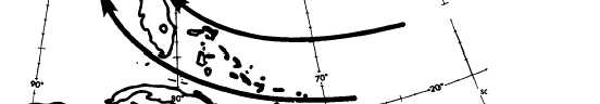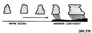 the air moves over a warmer land mass. (See fig. When mT air moves slowly northward over the continent, ground fogs frequently form at night. Sea fogs develop whenever this air flows over a relatively cold current such as that occur-ring off the east coast. The notorious fogs over the Grand Banks of Newfoundland are usually formed by this process. In late summer, the Bermuda high intensifies at times and seems to retrograde westward. This results in a general flow of mT air over Texas, New Mexico, Arizona, Utah, Colorado, and even southern California. The mT air reaching these areas is very unstable because of the intense sur-face heating and orographic lifting it undergoes after leaving the source region in the Caribbean and Gulf of Mexico. Shower and thunderstorm conditions, frequently of cloudburst intensity, then prevail over the southwestern states. Locally this condition is termed sonora weather. |