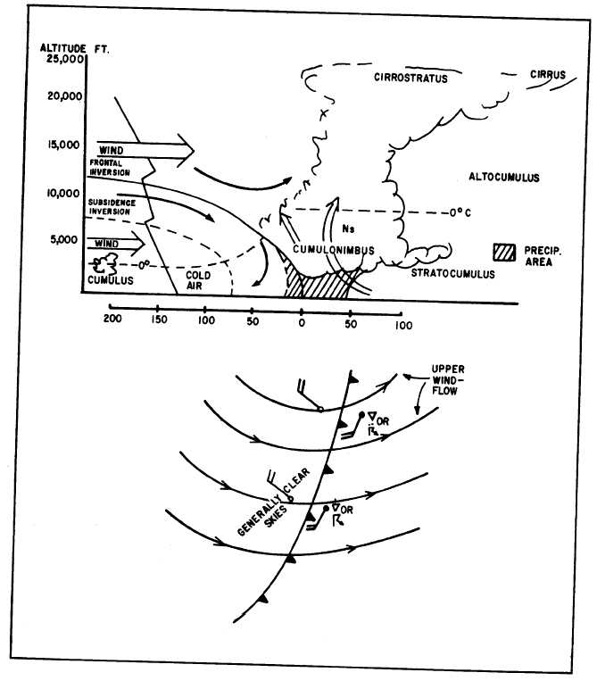 Click here to Order your Radar Equipment Online FAST-MOVING COLD FRONTS (INACTIVE COLD FRONT) The fast-moving cold front is a very steep front that has warm air near the surface being forced vigorously upward. At high levels, the warm air is descending downward along the frontal surface. This front has a slope of 1:40 to 1:80 miles and usually moves rapidly; 25 to 30 knots may be considered an average speed of movement, They move with 80 to 90 percent of the wind component normal to the front. As a result of these factors, there is a relatively narrow but often violent band of weather.Figure 4-3-2 shows a vertical cross section of a fast-moving cold front with resultant weather. Also indicated in the lower half of the diagram is the surface weather in advance of the front and the upper airflow above the front.If the warm air is moist and unstable, a line of thunderstorms frequently develops along this front. Sometimes, under these conditions, a line of strong convective activity is pro-jected 50 to 200 miles ahead of the front and parallel to it. This may develop into a line of thunderstorms called a squall line. On the other hand, when the warm air is stable, an overcast layer of altostratus clouds and rain may extend over a large area ahead of the front. If the warm air is very dry, little or no cloudiness is associated with the front. The front depicted is a typical front with typical characteristics.The fast-moving cold front is considered an INACTIVE front because lifting occurs only at and ahead of the front. The lifting is caused by descending air ahead of the front and only in part by the frontal surface.Surface Characteristics Pressure tendencies fall ahead of the front with sudden and strong rises after frontal passage.Weather Cumulonimbus clouds are observed along |