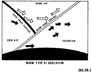 Figure 4-5-4.Vertical cross section of a warm type of Figure 4-5-5 depicts atypical warm type of oc-clusion in both the vertical and horizontal. Surface Characteristics The warm type of occlusion has the same type of pressure pattern as the cold type of occlusion. The most reliable identifying characteristics of the upper front are as follows:1. A line of marked cold frontal precipitation and clouds ahead of the occluded front2. A slight but distinct pressure trough 3. A line of pressure-tendency discontinuities NOTE: The pressure tendency shows a steady fall ahead of the upper cold front and, with passage, a leveling off for a short period of time. Another slight fall is evident with the approach of the surface position of the occlusion. After passage the pressure shows a steady rise.The pressure trough is often more distinct with the upper front than with the surface front.Weather The weather associated with warm front oc-clusions has the characteristics of both warm and cold fronts. The sequence of clouds ahead of the occlusion is similar to the sequence of clouds ahead of a warm front; the cold front weather occurs near the upper cold front. If either the warm or cool air that is lifted is moist and unstable, showers and sometimes thunderstorms may develop. The intensity of the weather along the upper front decreases with distance from the apex. Weather conditions change rapidly in occlusions and are usually most severe during the initial stages. However, when the warm air is lifted to higher and higher altitudes, the weather activity diminishes. When showers and thunderstorms oc-cur, they are found just ahead and with the up-per cold front. Normally, there is clearing weather after passage of the upper front, but this is not always the case. |