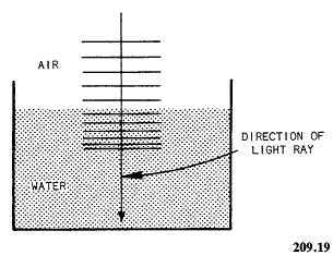Figure 5-3-7.Wave front diagram illustrating refraction of When a ray of light enters a denser medium at an angle of 90, as shown in figure 5-3-8, the wave fronts slow down but remain parallel. When this same light ray enters a in the air. Consequently, the ray bends toward the normal. (See fig. 5-3-6.) If the light ray enters a less dense medium, at an oblique angle, the ray bends away from the normal as shown in figure 5-3-7. The portion of the wave front that enters the less dense substance travels faster than the other part of the wave front. Consequently, the ray bends away from the normal. When a beam of white light is passed through a prism, as shown in figure 5-3-2, it is refracted and dispersed into its component wavelengths. Each of these wavelengths reacts differently on the eye, which then sees the various colors that compose the visible spectrum. The visible spectrum ranges in color from violet at one end to red at the other end. (See fig. 5-3-2.) There are six distinct colors in the spec-trum: red, orange, yellow, green, blue, and violet. However, a mixture of these colors is also present. Learning Objective: Identify the characteristics of photometers (halos, coronas, rainbows, fogbows, mirages, looming, scintillation and crepuscular rays).