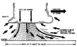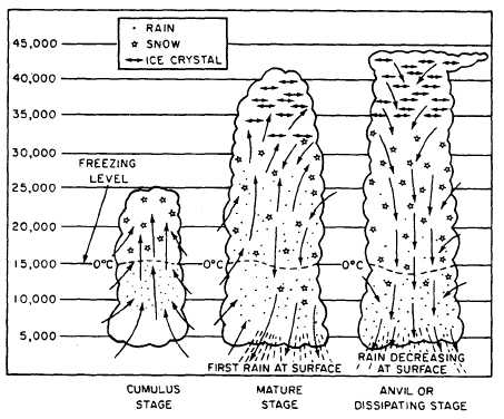 Click here to Order your Radar Equipment Online Structure The fundamental structural element of the thunderstorm is the unit of convective circulation known as the convective cell. A mature thunderstorm contains several of these cells, which vary in diameter from 1 to 6 miles. By radar analysis and measurement of drafts, it has been determined that, generally, each cell is independ-ent of surrounding cells of the same storm. Each cell progresses through a cycle which lasts from 1 to 3 hours. In the initial stage (cumulus development), the cloud consists of a single cell, but as the development progresses, new cells form and older cells dissipate.The life cycle of the thunderstorm cell con-sists of three distinct stages; they are the cumulus stage, the mature stage, and the dissipating or anvil stage. (See fig. 5-4-1.)CUMULUS STAGE. Although most cumu-lus clouds do not become thunderstorms, the in-itial stage of a thunderstorm is always a cumulus cloud. The chief distinguishing feature of this cumulus or building stage is an updraft which prevails throughout the entire cell. Such updrafts vary from a few feet per second in the early cells to as much as 100 feet per second in mature cells.MATURE STAGE. The beginning of sur-face rain, with adjacent updrafts and downdrafts, initiates the mature stage. By this time the top of the average cell has attained a height of 25,000 feet or more. As the raindrops begin to fall, the frictional drag between the raindrops and the sur-rounding air causes the air to begin a downward motion. Since the lapse rate within a thunderstorm cell is greater than the moist adiabatic rate, the