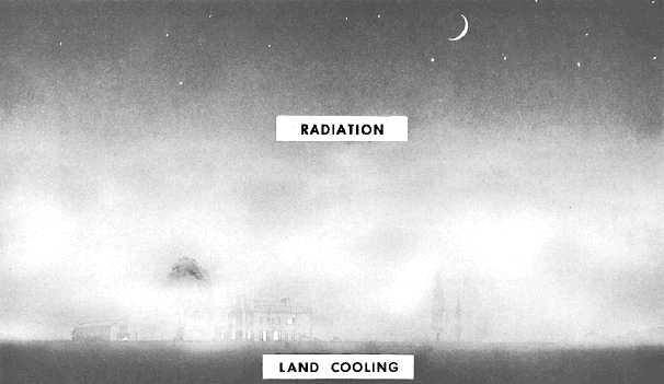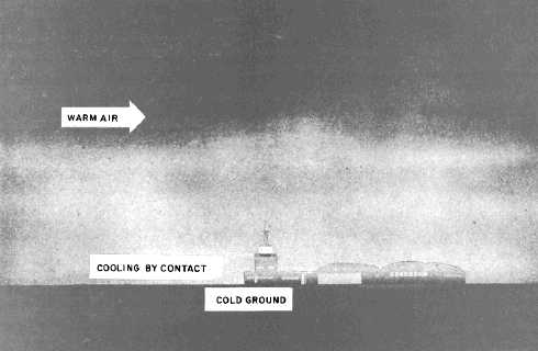 Click here to Order your Radar Equipment Online RADIATION FOG. Radiation fog, which generally occurs as ground fog, is caused by the radiational cooling of Earths surface. It is primarily a nightime occurrence, but it often begins to form in the late afternoon and may not dissipate until well after sunrise. It never forms over a water surface. Radiation fog usually covers a wide area.After sunset, Earth receives no heat from the Sun, but its surface continues to reradiate heat. The surface begins to cool because of this heat loss, As Earth cools, the layer of air adjacent to the sur-face is cooled by conduction (the transfer of heat from warmer to colder matter by contact). This causes the layer near Earth to be cooler than the air immediately above it, a condition called an in-version. If the air beneath the inversion layer is sufficiently moist and cools to its dew point, fog forms. (See fig. 5-1-2.) In case of a calm wind, this cooling by conduction affects only a very shallow layer (a few inches deep), since air is a poor con-ductor of heat. Wind of low speed (3 to 5 knots) causes slight, turbulent currents. This turbulence is enough to spread the fog through deeper layers. As the nocturnal cooling continues, the air tem-perature drops further, more moisture is con-densed, and the fog becomes deeper and denser. If winds increase to 5 to 10 knots, the fog will usually thicken vertically. Winds greater than 10 knots usually result in the formation of low scud, stratus, or stratocumulus.After the Sun rises, Earth is heated. Radia-tion from the warming surface heats the lower air, causing evaporation of the lower part of the fog, thereby giving the appearance of lifting. Before noon, heat radiated from the warming surface of Earth destroys the inversion and the fog evaporates into the warmed air. Radiation fog is common in high-pressure areas where the wind speed is usually low (less than 5 knots) and clear skies are frequent. These conditions permit maximum radiational cooling.ADVECTION FOG.Advection fog is the name given to fog produced by air in motion or to fog formed in one place and transported to another. This type of fog is formed when warmer air is transported over colder land or water surfaces. Cooling from below takes place and gradually builds up a fog layer. The cooling rate depends on the wind speed and the difference between the air temperature and the temperature of the surface over which the air travels. Advection fog can form only in regions where marked temperature contrasts exist within a short distance of each other, and only when the wind blows from the warm region toward the cold region. (See fig. 5-1-3.) It is easy to locate areas of temperature contrast on the weather map, as they are usually found along coastlines or between snow-covered and bare ground. Sea Fog. Sea fog is always of the advection type and occurs when the wind brings moist,