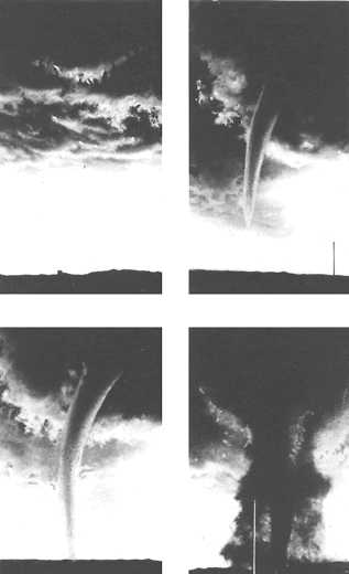 Click here to Order your Radar Equipment Online Tornadoes A tornado is an extremely violent whirling storm with a small diameter, usually a quarter of a mile or less. The length of the track of a tornado on the ground maybe from a few hundred feet to 300 miles; the average is less than 25 miles. When not touching the ground, it is termed a funnel cloud or tuba. The velocities of tornadic winds are in the general range of 125 to 250 knots. A large reduction of pressure in the center due to the spiraling of the air seems to cause buildings in the path of the storm to explode. The speed of the storm over Earths surface is comparatively slow usually 22 to 34 knots.Most of the tornadoes in the United States occur in the late spring and early summer in mid and late afternoon, and they are associated with thunderstorm activity and heavy rain. Tornadoes occur on all continents but are most common in Australia and the United States. They can occur throughout the year and at any time of day. Tornadoes have been observed with various synoptic situations but are usually associated with overrunning cold air. Statistics show that the majority of tornadoes appear about 75 to 180 miles ahead of a cold front along the prefrontal squall line. Figure 5-1-6 shows the various stages of development of a tornado.A situation that is noticeably favorable to tor-nado activity is cold air advection aloft. When mP air moves across the United States, it becomes heated in the low levels in the western plateaus.