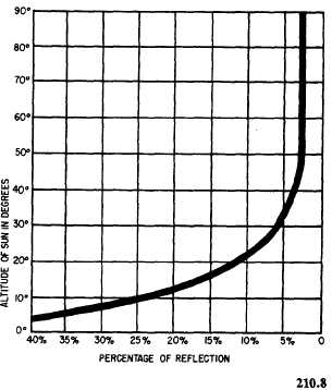 Click here to Order your Radar Equipment Online Effects of Air-Sea Interchange The atmosphere and the oceans have tre-mendous effects on each other. These effects are principally in the realms of temperature and water vapor. The heat balance of the oceans is main-tained by the processes of radiation, the exchange of sensible heat, and the evaporation and conden-sation of water vapor on the sea surface. The amount of radiant energy absorbed by the sea depends upon the amount of energy reaching the surface and the amount of reflection by the surface. When the Sun is directly overhead, the amount of its energy reflected amounts to only about 3 percent. Even when the Sun is 30 above the horizon, the amount of reflection is just 6 percent. However, there is a reflection of about 25 percent of the energy when the Sun is 10 above the horizon. (See fig. 6-7-1.) Reflection loss is especially great in the presence of waves when the Sun is low. Much of the insolation is absorbed in the first meter of seawater. This is true of the clearest water as well as of quite turbid (opaque) water. In water that is extremely turbid, the absorption is in the very uppermost layers. Foam and air bubbles are two major causes of a proportionately greater amount of absorption in the uppermost meter of the sea. However, due to vertical mixing, the heat absorbed in the upper layer is carried