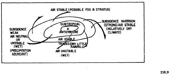 2. East of a subtropical high. Along the a. It is coming from the northern, cooler portion of the source region. b. Its surface layers remain cool because it moves over cold ocean currents. c. Its upper portions warm adiabati-cally because of subsidence. Throughout the year, airways are smooth. The skies are clear to partly cloudy. Clouds are generally patches of stratocumulus, and rain is rare. The chief flight hazard in this air is coastal fog, which often hides the California or European coastal land. Stratus and stratocumulus clouds may cause the sky to be overcast, develop low ceilings, and produce drizzle that reduces visibility. 3. South of a subtropical high. Where the mT air moves southward or southwestward (as trade winds), its lower layers are warmed by the tropical ocean surface. This produces scat-tered cumulus. Near the equator, after absorb-ing much moisture and being heated, this air may develop cumulonimbus. 4. West of a subtropical high. This mT air blows from the east and the southeast. Since it flows over warm water all of the way, the air neither cools or warms. Over the ocean near the Philippines (and near Florida and the West Indies), this trade wind brings good flying weatherclear or scattered cumulus clouds. When it is moving over land, this warm, moist air becomes unstable and turbulent and is a source of thunderstorms. When it moves over cold land (for example, southeastern United States in the winter), it becomes stable and produces stratus clouds or fog. Over cold ocean surfaces, such as the Sea of Japan and the Kamchatka and Labrador currents, it develops the persistent low stratus and fogs characteristic of these areas. |