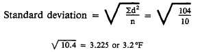 The average deviation of temperature during To compute the standard deviation: 1. Square the deviations from the mean (column 3). 2. Total these squared deviations. In this case, the total is 104. 3. Apply the formula for standard