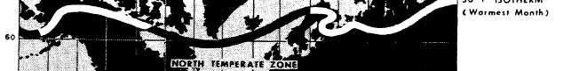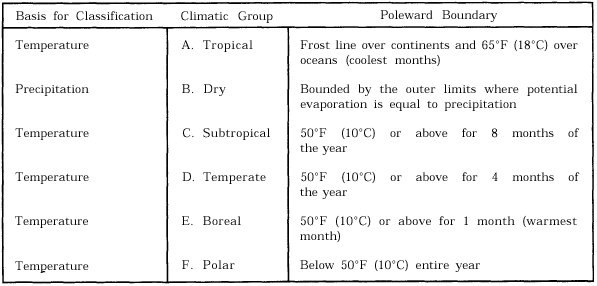 Thomthwaits classification of climates places Kppens classification includes five main climatic types. They are TROPICAL RAIN, DRY, WARM TEMPERATE RAINY, COOL SNOW FOREST (Boreal), and POLAR climates. These main types are further divided into climatic provinces. The Kppen classification is based mainly on temperature, precipitation amount, and season of maximum precipita-tion. Numerical values for these elements con-stitute the boundaries of the above types, which were selected primarily according to their effect on plant growth. Figure 6-4-2, a foldout at the end of the chapter, shows Kppens climatic types. Kppens climatic types are still considered valid today. His climatic zones, like others, are by no means static. Climatic zones shift with long-range weather patterns. The most noticeable shifts in these climatic zones have been observed over the northern portions of North America and Asia and over Africa. Russia and Canada, for example, have been able to farm land at higher latitudes over the past 200 years due to milder temperatures. Recent studies, however, indicate a general return of cooler temperatures at high latitudes, and now the growing region is gradually moving southward again where temperatures are more moderate. In Africa, desert regions have made notable shifts southward due to decreasing precipitation. Trewartha is the most recent classifier of climate. Initially, his climatic classifications were based on Koppens; however, over the years, he has made significant changes and is now recognized for developing his own six climatic groups. These six groups are TROPICAL, DRY, SUBTROPICAL, TEMPERATE, BOREAL, AND POLAR. Five of these groups are based on temperature and one is based on precipitation (see Table 6-4-1). Trewarthas climatic groups, like Kppens, are also further broken down into climatic types and subtypes. Table 6-4-1.Trewarthas