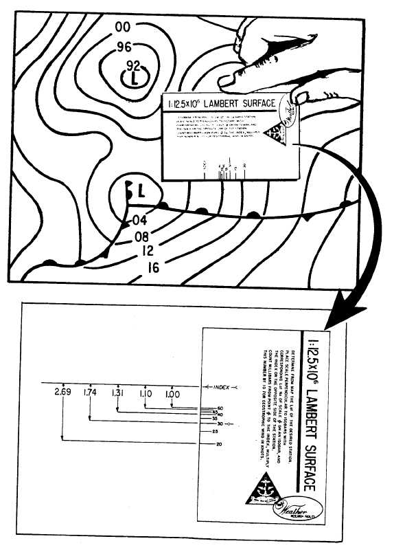 Click here to Order your Radar Equipment Online Use of Geostrophic Wind Scale (Overlay type) See illustration shown in figure 7-2-5. TO DETERMINE THE WIND SPEED, select the appropriate wind scale for your map and map scale. Determine the latitude at the point you want to compute the wind speed. Place the corresponding latitude number from your overlay on one side of the isobars closest to your point. Count the number of millibars between the latitude mark on the overlay and the overlay index (interpolation may be required). Multiply this number by 10 to obtain the geostrophic wind speed.In our illustration, the point of latitude is 45. Align the 45-degree mark on the over-lay with the 1012 isobar at this latitude. The index mark rests on what would be the 1010 mb. Therefore, the number of millibars between the 45-degree mark and the index is 2 mb. Mul-tiplying this number (2) times 10 gives us a geostrophic wind speed of 20 knots.