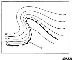 Click here to Order your Radar Equipment Online FRONTAL ANALYSIS The thermal gradient is by far the most impor-tant guide in locating fronts. The 850- and 700-mb isotherm analyses are used as aids in determining the location, strength, and vertical extent of fronts. Isotherms generally parallel fronts, with the tightest packing (gradient) in the cold air (fig. 8-1-9). On upper-level charts that do not show fronts, isotherms are continuous lines. On those showing fronts, the isotherms may be discontinuous. The thermal gradient and pattern in relation to fronts give an indication of a fronts strength. The weaker the gradient (in the cold air), the weaker the front and the greater the probability that the front has a shallow slope. The tighter the gradient, the stronger the front. Isotherms may parallel cold fronts for long distances; however, somewhere to the north the isotherms may cross these fronts. Any appreciable crossing of these fronts by the isotherms indicates the front is occluded. Secondary cold fronts may also show an isotherm pattern that is more or less