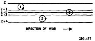 Figure 8-5-1.Illustration of vorticity due to the shear effect. example causes two of the three parcels to rotate. 1. Parcel No. 1 has stronger wind speeds to its right. As the parcel moves along, it is rotated in a counterclockwise direction and thus has positive vorticity. 2. Parcel No. 2 has the stronger speed to its left; therefore, it rotates in a clockwise direction as it moves along. Its vorticity is negative. 3. Parcel No. 3 has speeds evenly distributed. Theres no shear. The parcel moves, but it does not rotate. It has zero vorticity. Remember, air parcels have vorticity (rotation) when the wind speed is stronger on one side of the parcel than on the other. CURVATURE. Vorticity also results from curvature of the air flow or path. Examine figure 8-5-2 and try to imagine the progress (and direction of spin) of an air parcel traveling in the stream. In the trough and ridge, the diameter of the parcel is rotated from the solid line to the dotted position (because of the northerly and southerly wind components on either side of the trough and ridge lines). Parcels have